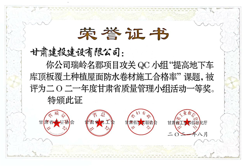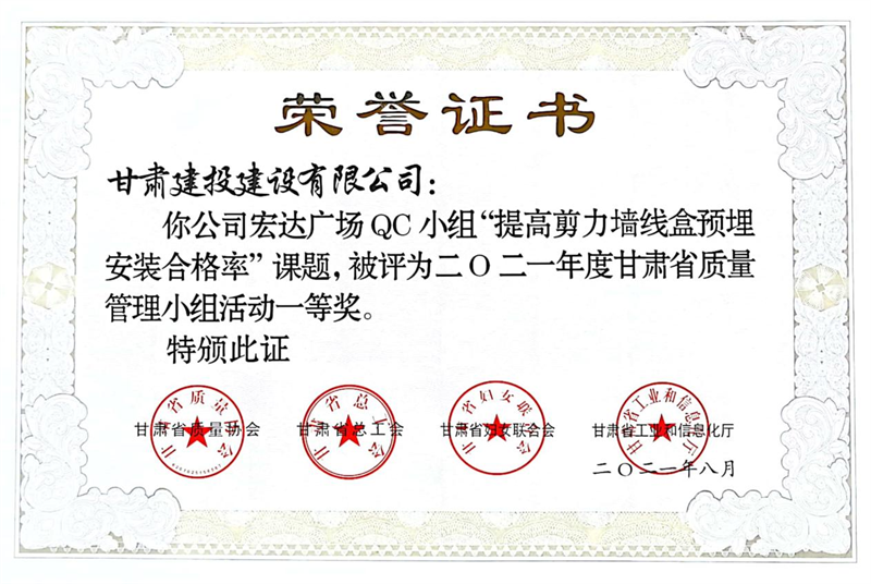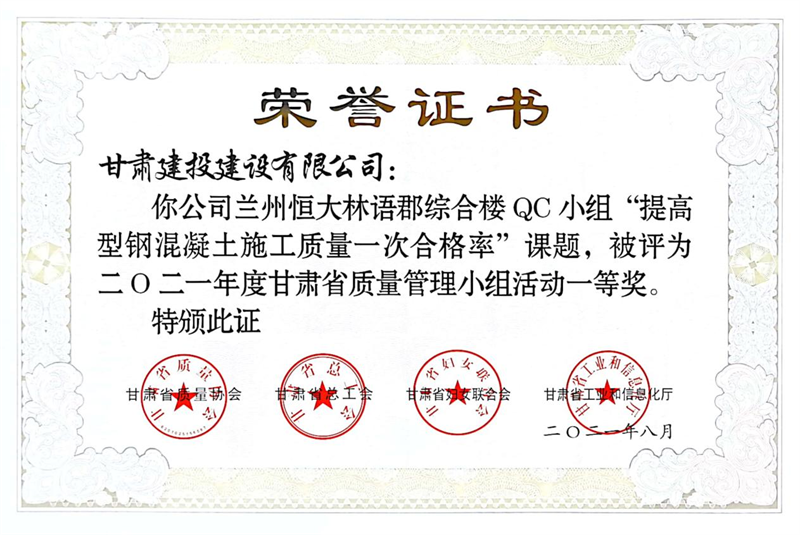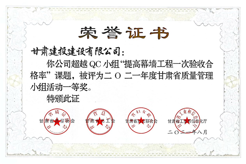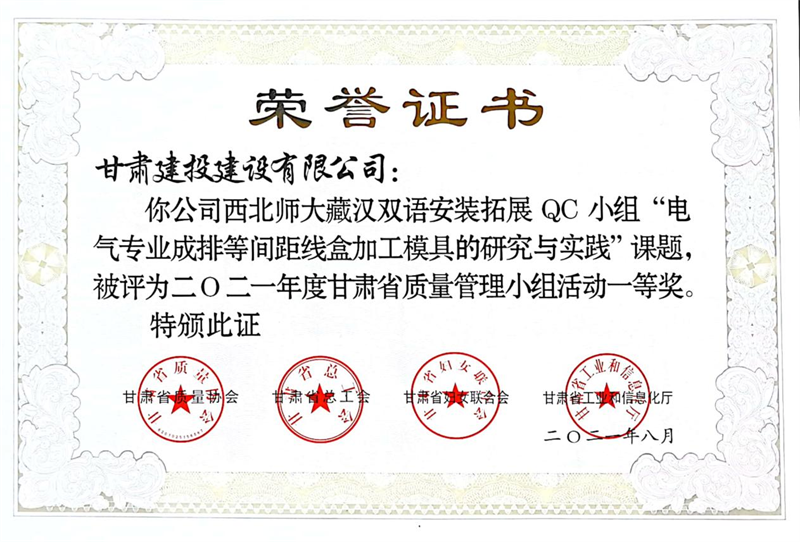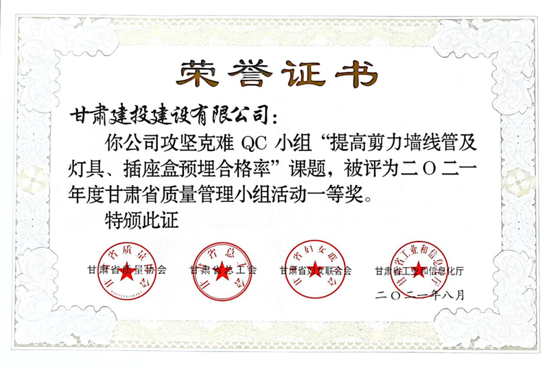 建設公司申報的36項QC成果中,1項成果獲全國“工程建設質量管理小組二類成果,1項成果獲“甘肅省質量管理小組活動最高榮譽獎——特等獎”、14項成果獲一等獎、19項成果獲得二等獎、2項成果獲得三等獎。建設公司榮獲“2021年度甘肅省質量管理小組活動優(yōu)秀企業(yè)”稱號,這是繼2019年后,公司連續(xù)三年獲此殊榮。