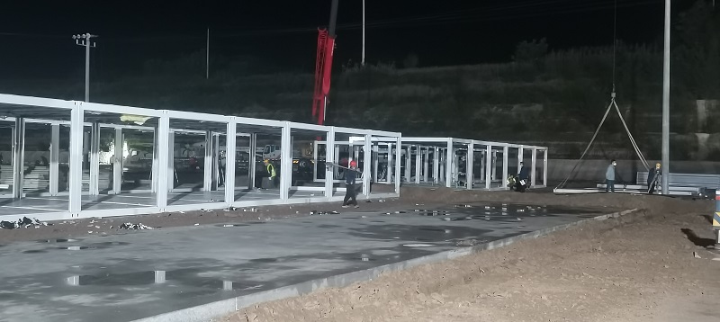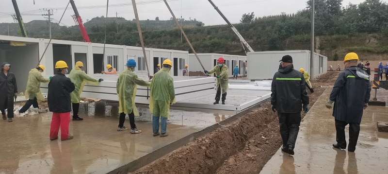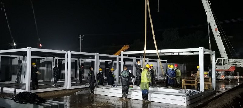 因疫情和連續(xù)降雨天氣,給施工造成一定困難,項(xiàng)目部全體人員風(fēng)雨里、泥濘中拼搏共進(jìn),分秒必爭(zhēng),加快“逆行”腳步,顧不得休息,24小時(shí)不間斷輪班施工,全力以赴,統(tǒng)籌協(xié)調(diào)人力、物力、機(jī)械。截至目前已完成100間集裝箱的框架安裝和40套墻板安裝任務(wù),衛(wèi)浴設(shè)施及水電也在緊張施工過程中,剩余未完成工程量的材料已全部發(fā)貨,其他要素正逐項(xiàng)配齊。