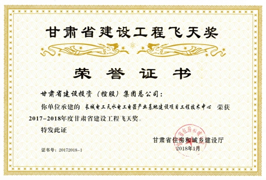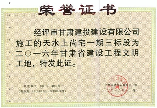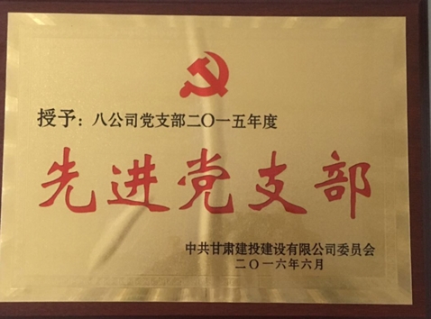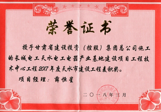 公司2015年度被中共甘肅建投建設有限公司黨委評為“先進黨支部”榮譽稱號,2016年度被甘肅建投建設有限公司評為“先進集體”榮譽稱號。天水總部經(jīng)濟城7#樓、天水上尚宅5#、9#樓被評為省級安全文明工地,中海河山郡二期23#、27#樓及相連地下車庫工程被評為“建設杯”二等獎,長城工程技術中心項目榮獲“麥積獎”“飛天獎”,長城電工中壓氣體絕緣廠房項目“大面積耐磨地坪結合鋼釬維混凝土施工”獲得省級工法。