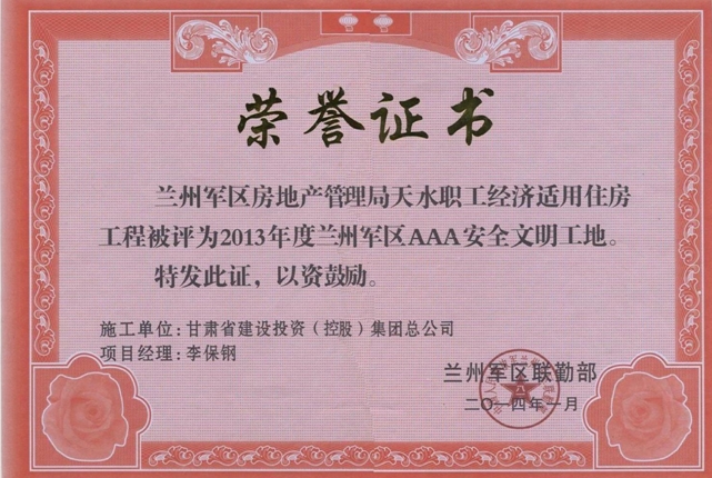 公司五年內無死亡事故及無重大環(huán)境污染和擾民事件的發(fā)生,安全生產合格率100%,施工產值達到192707.82萬元,竣工面積為1684836m2;臨夏市體育場項目榮獲“全國AAA級安全文明標準化工地”,蘭州軍區(qū)天水職工住宅樓項目榮獲蘭州軍區(qū)“AAA級安全文明工地”,甘肅省人民醫(yī)院住院部二期7號樓8號樓項目、東川棚戶區(qū)改造AD塊9號樓10號樓項目、古浪昌靈小區(qū)公租房項目榮獲甘肅省省級文明工地,西寧城市綜合管廊項目榮獲青海省安全標準化示范省級文明工地獎項 。