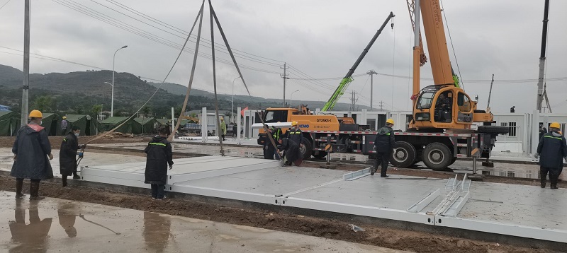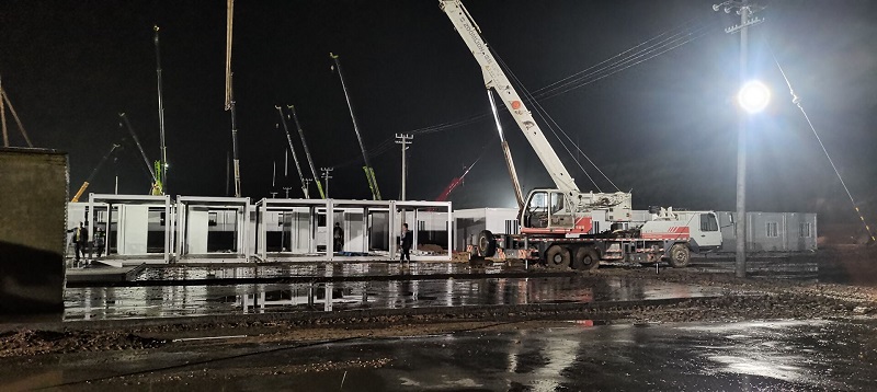 因疫情和連續(xù)降雨天氣,給施工造成一定困難,項目部全體人員風雨里、泥濘中拼搏共進,分秒必爭,加快“逆行”腳步,顧不得休息,24小時不間斷輪班施工,全力以赴,統(tǒng)籌協(xié)調(diào)人力、物力、機械。截至目前已完成100間集裝箱的框架安裝和40套墻板安裝任務,衛(wèi)浴設施及水電也在緊張施工過程中,剩余未完成工程量的材料已全部發(fā)貨,其他要素正逐項配齊。