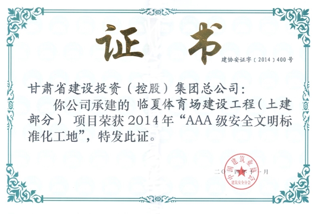 公司五年內無死亡事故及無重大環(huán)境污染和擾民事件的發(fā)生,安全生產合格率100%,施工產值達到192707.82萬元,竣工面積為1684836m2;臨夏市體育場項目榮獲“全國AAA級安全文明標準化工地”,蘭州軍區(qū)天水職工住宅樓項目榮獲蘭州軍區(qū)“AAA級安全文明工地”,甘肅省人民醫(yī)院住院部二期7號樓8號樓項目、東川棚戶區(qū)改造AD塊9號樓10號樓項目、古浪昌靈小區(qū)公租房項目榮獲甘肅省省級文明工地,西寧城市綜合管廊項目榮獲青海省安全標準化示范省級文明工地獎項 。